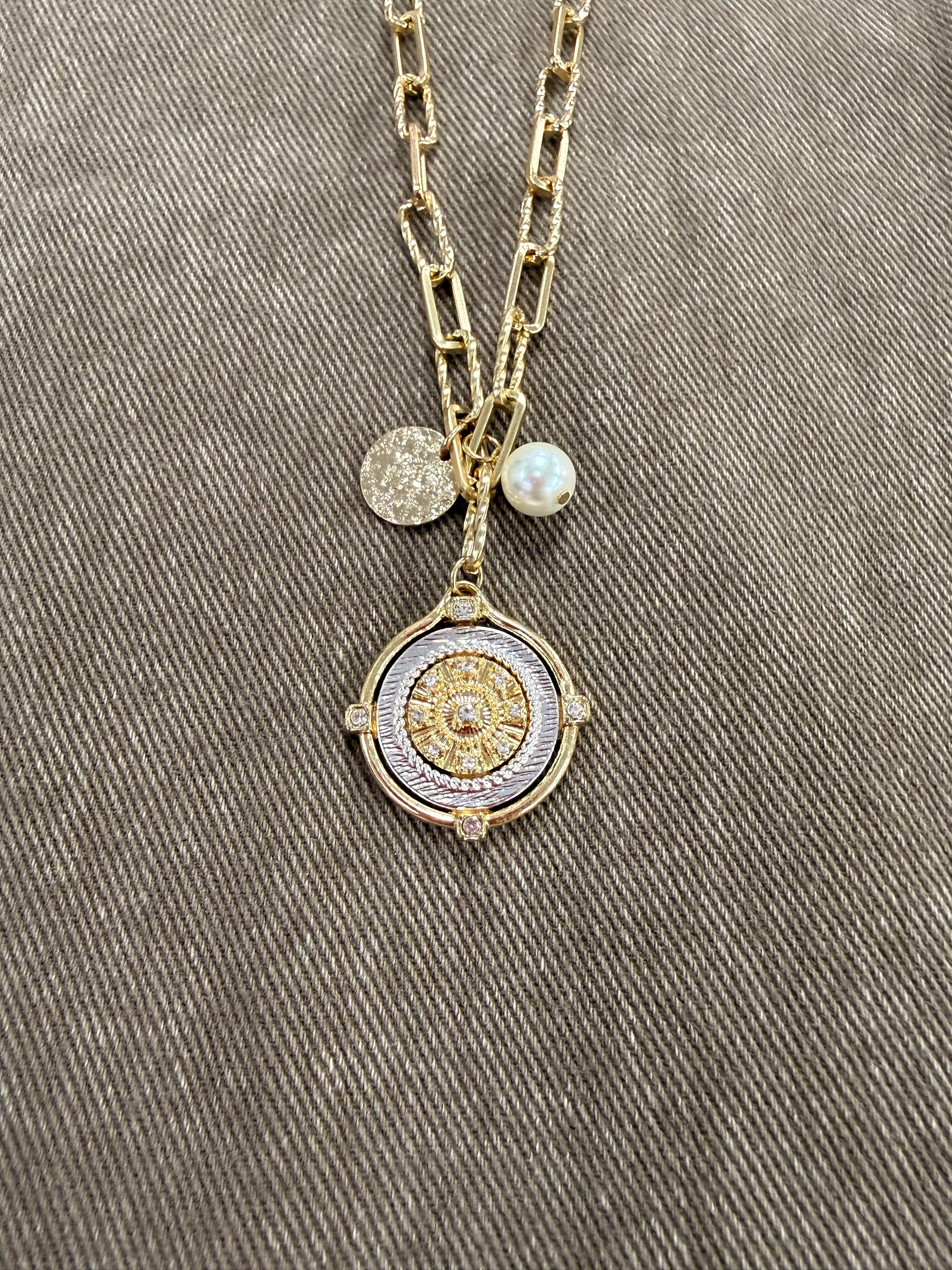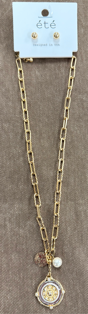 •Gold compass and pearl charm necklace, with matching gold earrings•