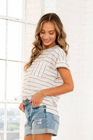 This casual striped top is the perfect blend of laid-back and chic. It features a relaxed silhouette with cuffed short sleeves and a front patch pocket for a touch of everyday charm. Effortless to style and easy to wear, it's a go-to piece for creating comfortable yet polished looks.