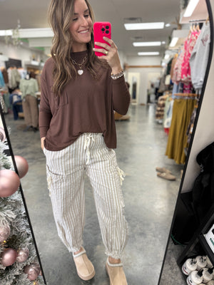 Effortlessly cool and ultra comfy, our Meadow Stripe Cargo Joggers are the perfect blend of relaxed and refined. The soft neutral stripes, adjustable ties, and gathered ankles give them that lived-in, boutique vibe you’ll want to wear everywhere. Lightweight, breathable, and oh-so-easy to style — pair with a tee, sweater, or denim jacket for the cutest everyday look. 🤎✨
