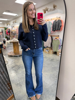 Timeless and elegant — our Midnight Pearl Cardigan features soft knit fabric and dainty pearl-style buttons for that effortlessly polished look. Perfect for pairing with denim or layering over your favorite dress. ✨