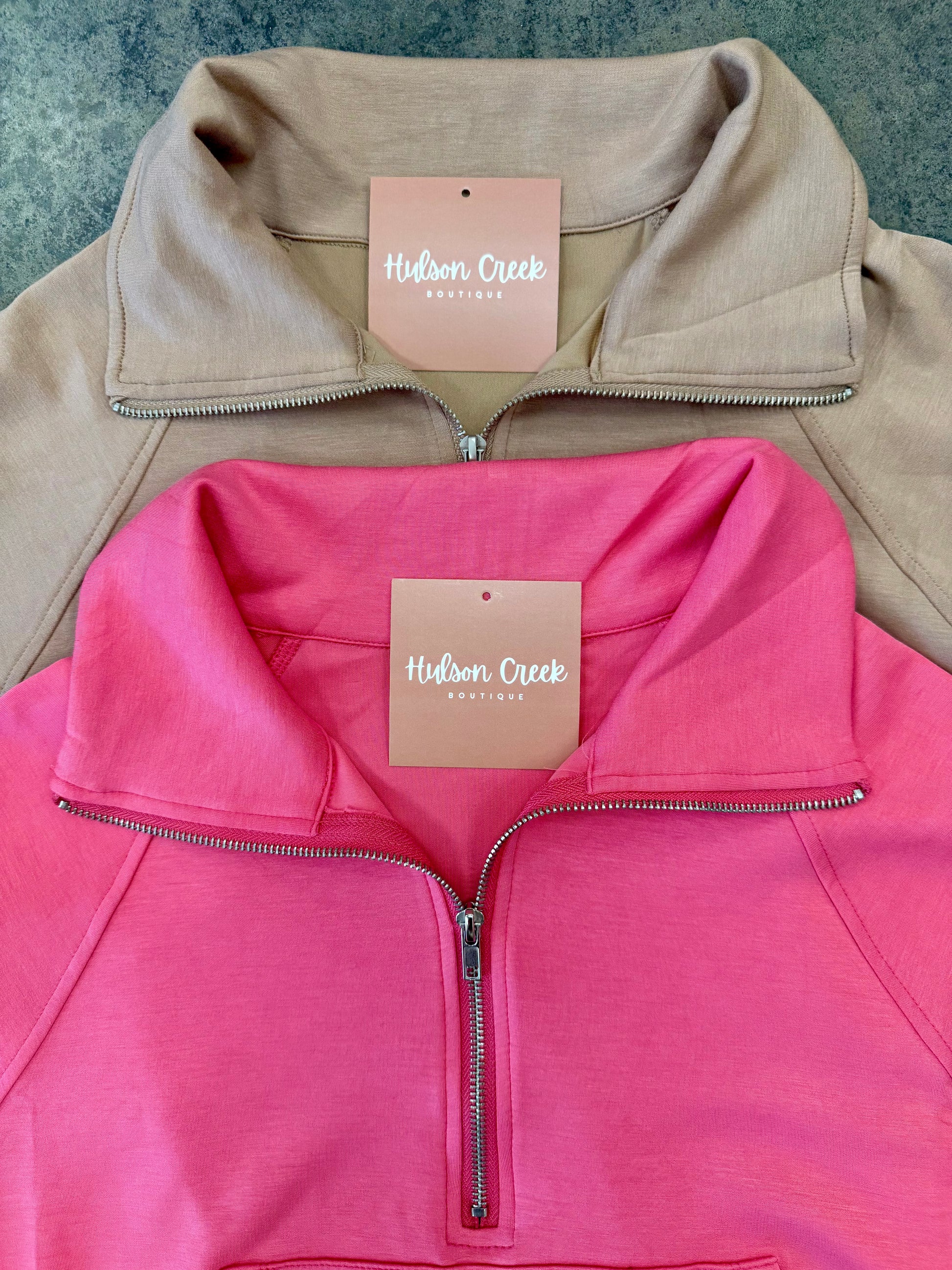 Sunset Hues Cropped Pullover 🌅: Catch the sunset vibes with our Sunset Hues Cropped Pullover. Featuring a half-zip and collar, a cropped length, and made with incredibly soft fabric ✨. Choose between the earthy dark taupe 🤎 or the sweet taffy pink 🩷!Â