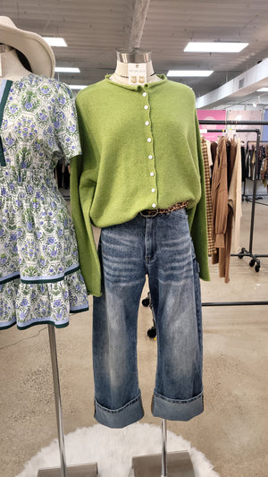 This cozy green cardigan is the perfect layering piece for every season. Featuring a classic button-front design with a relaxed, easy fit, it’s made from a soft knit that feels comfortable without being bulky. The fresh green hue adds a cheerful pop of color while still remaining neutral enough to pair with your favorite denim, dresses, or skirts. Finished with ribbed trim and a timeless silhouette, this cardigan is one you’ll reach for again and again.
