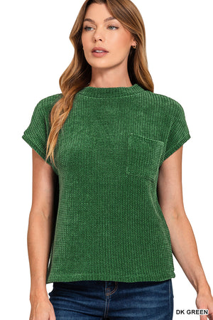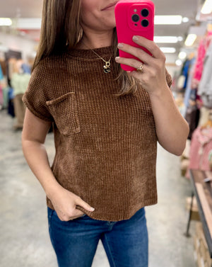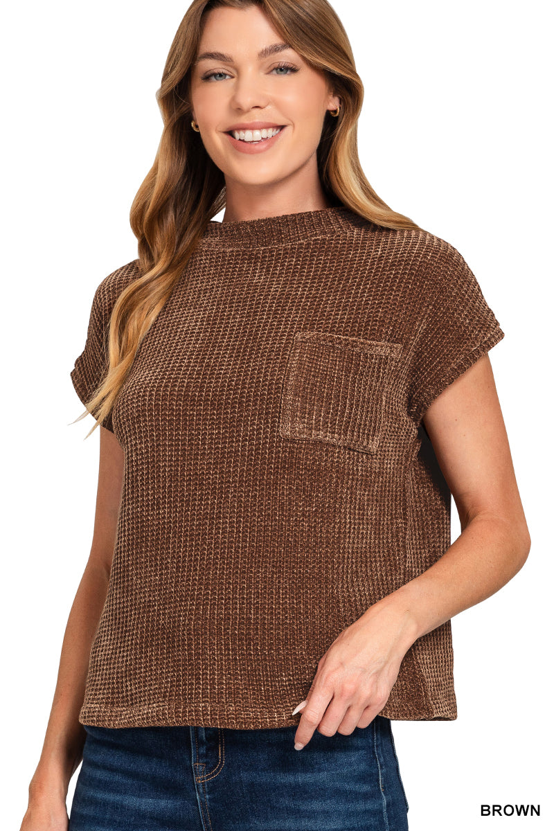 Your new soft-spot top! This ultra-plush chenille waffle knit sweater pairs cozy comfort with a polished finish. The short sleeves make it an easy, all-season piece — available in brown, green, and cabernet.